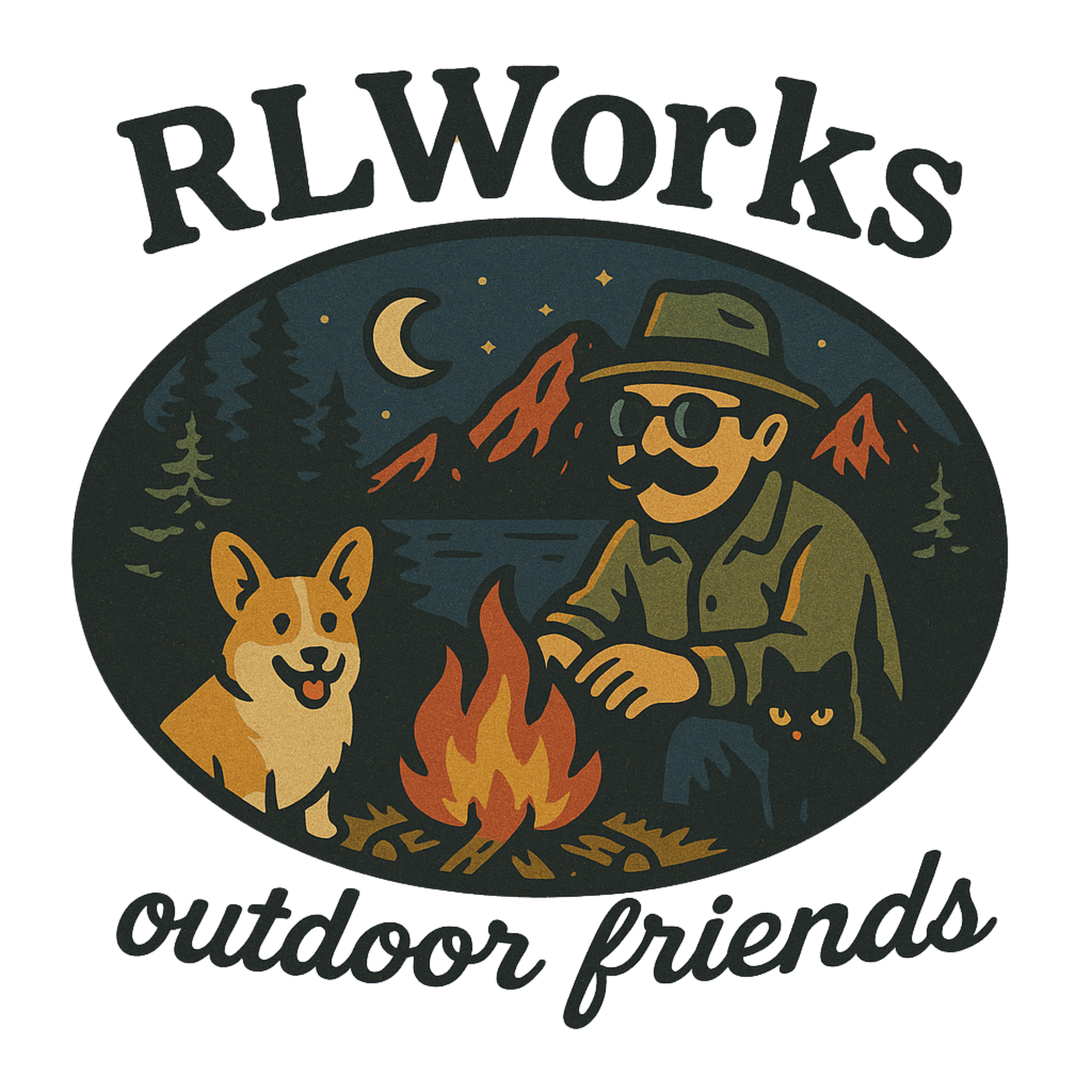 丸サングラスとカイゼル髭の名物おじさんが、今夜も焚き火を囲んでコーギーと黒猫とまったりキャンプ。