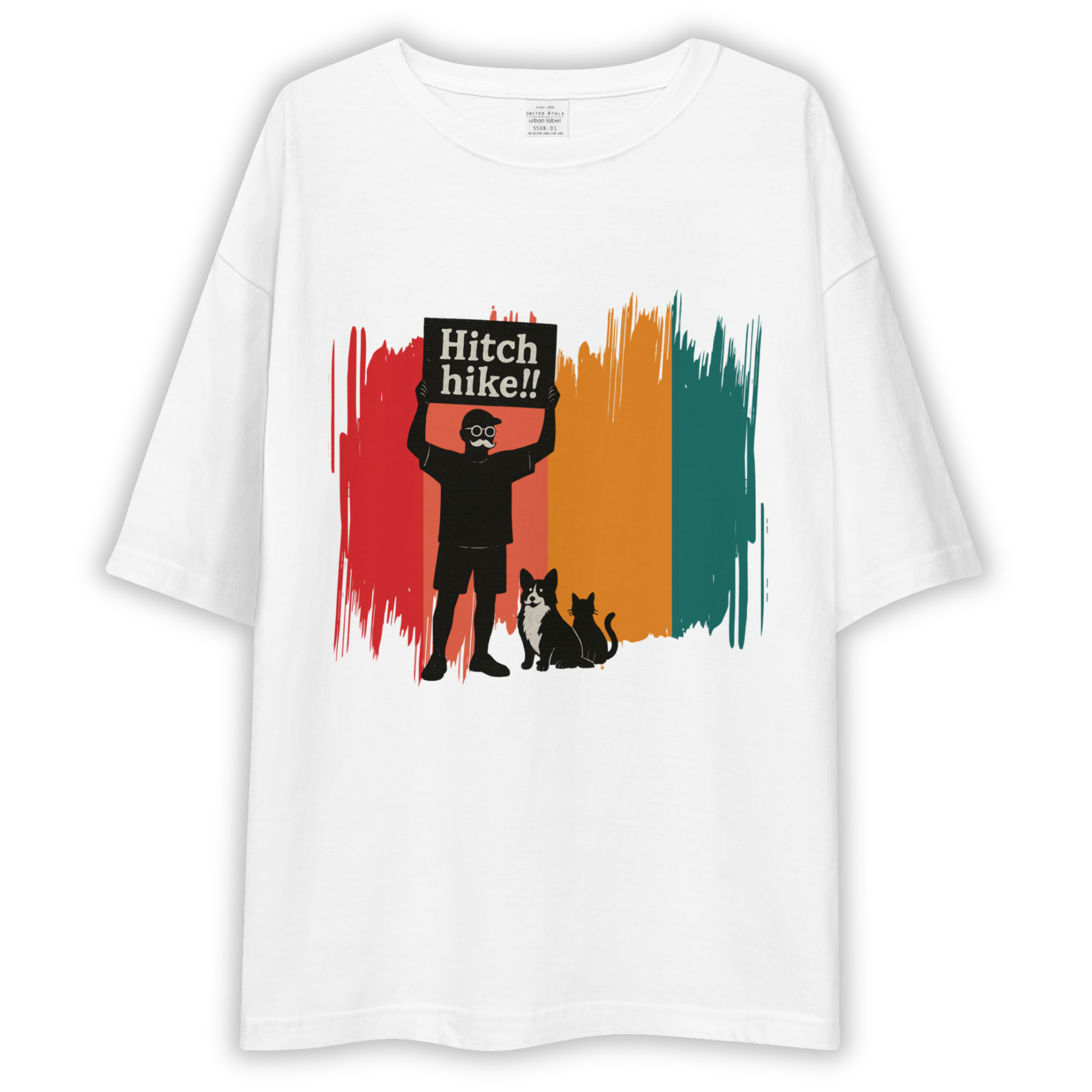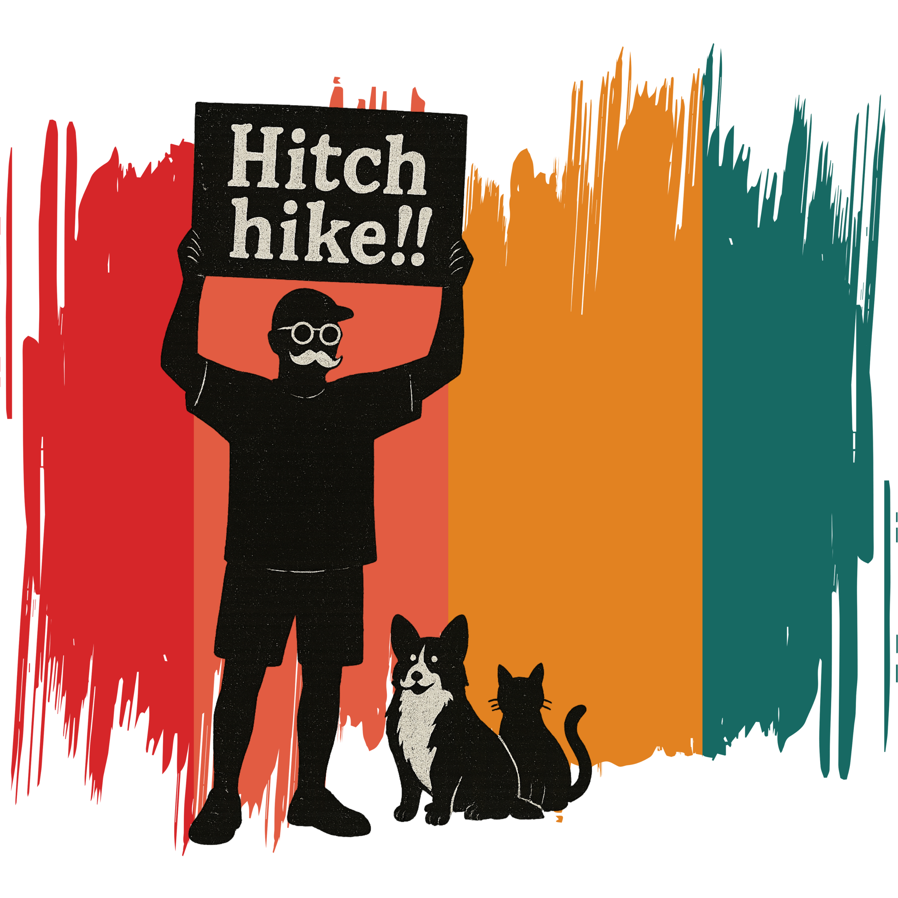 無表情なおじさんが掲げるのは、“Hitch hike!!”の看板。