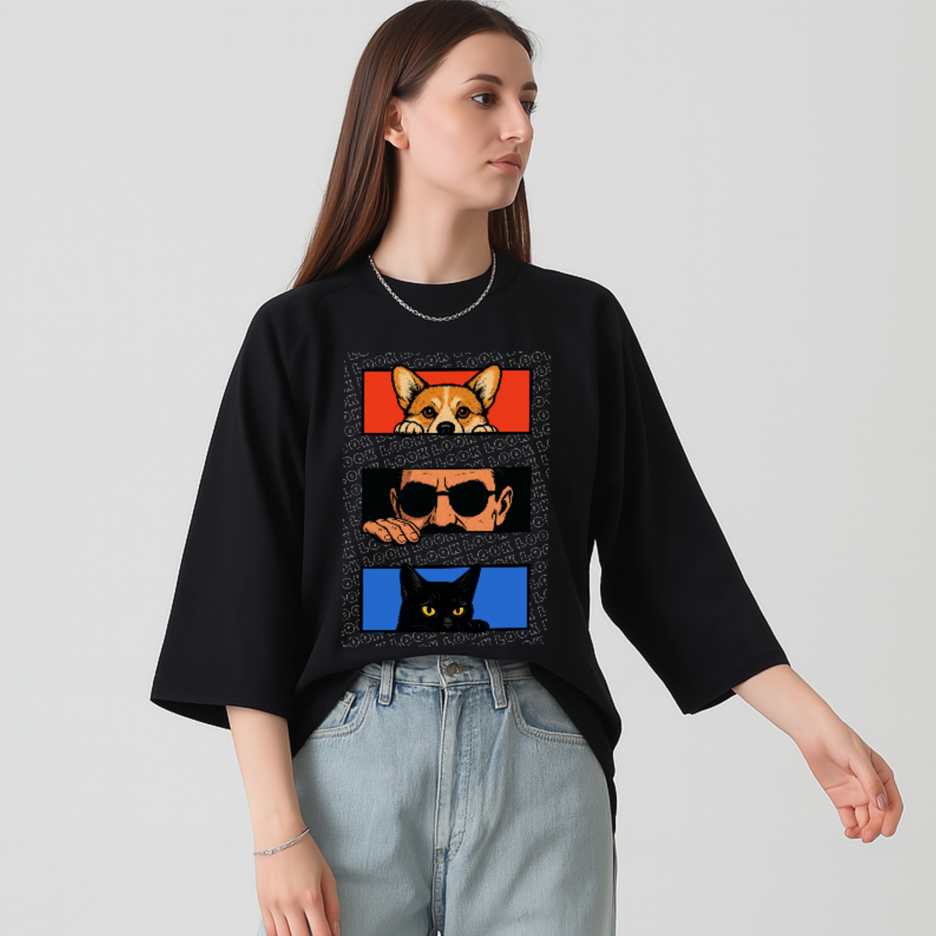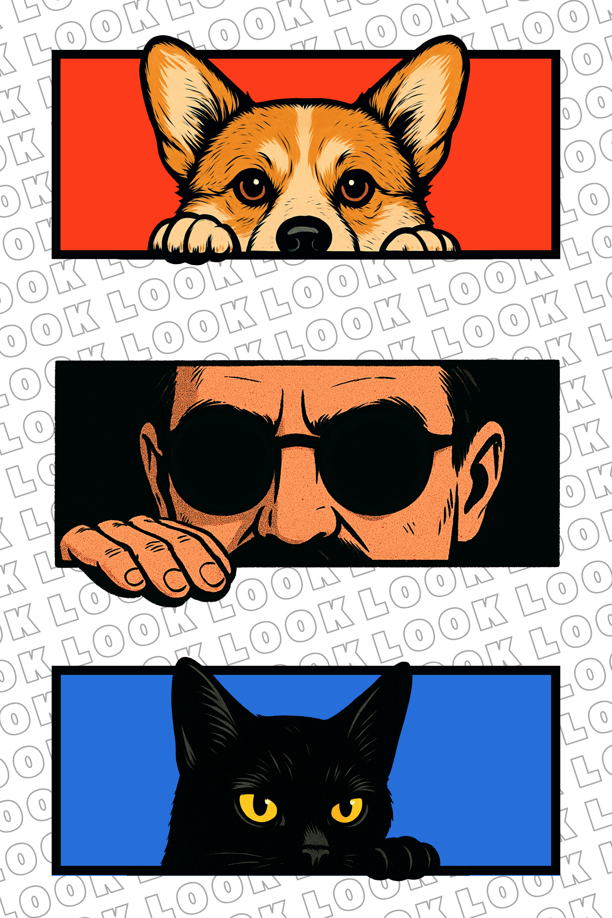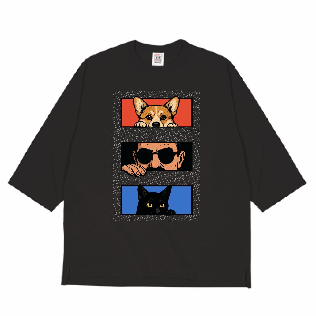 三者三様の「LOOK」が重なる一枚は、まるで街角の覗き見劇場。